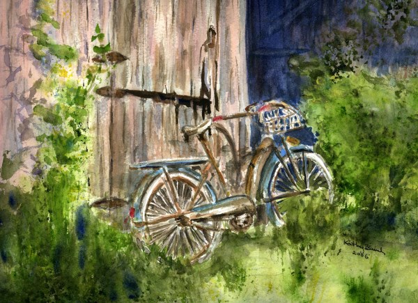 This old bike was up against an old barn at an auction. On the upper half of the barn was an old light on it, and had to become another painting. See "November"