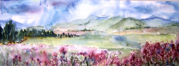 pink wildflowers, mist hanging in the foothills