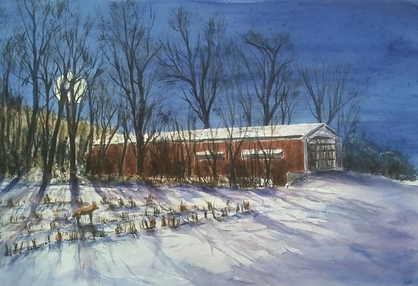 One of the 31 bridges in Parke County Indiana, home of the "Covered Bridge Festival" each October. The moonlit bridge has a visitor coming through the snow in the downed corn field.