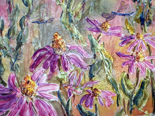watercolor on gouache has several dragonflies, and fairies hidden amongst the flowers.