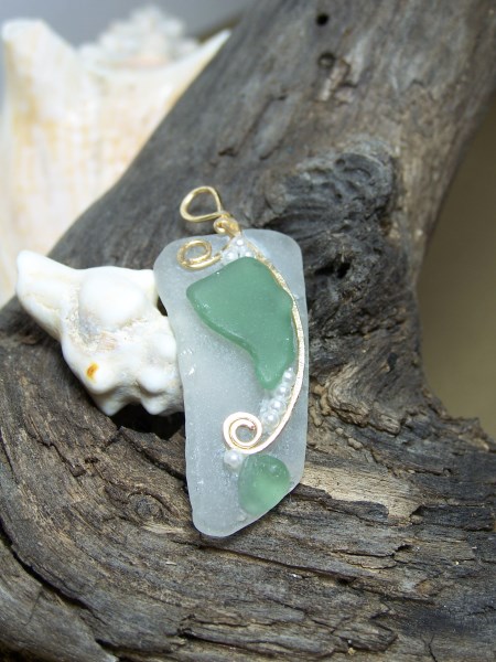 Long piece of white beachglass with 2 piece of green glass and genuine seed pearls, wrapped with gold filled wire (no chain)