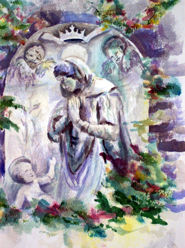 This painting was done from a wall plaque handing in the garden at St. Patricks Catholic Church in Kankakee Illinois, during a garden walk. There were vines growing all over it.