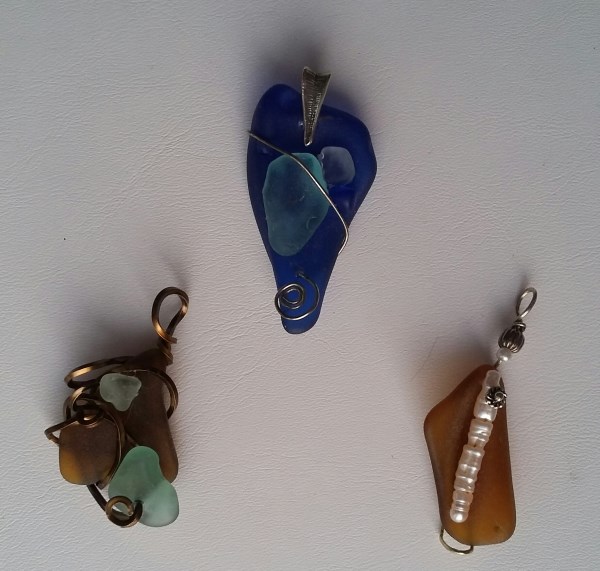 I make a large variety of beach glass jewelry from pieces I've found in Aruba, Michigan,Turkey, Cozumel, Pacific Northwest and Wisconsin. wire wrapping and drilling are some of the methods I use. please feel free to call and ask for specific colors.