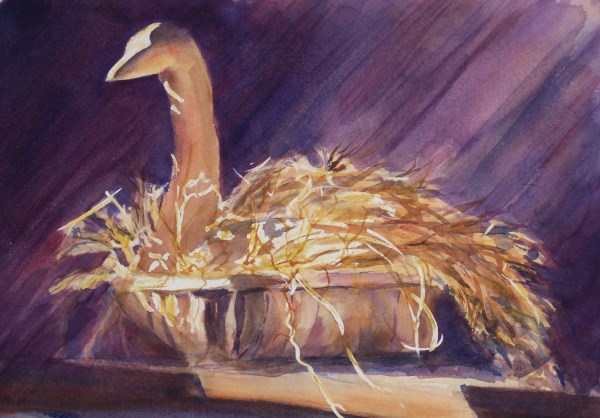 Wooden goose decoy in basket of straw.
