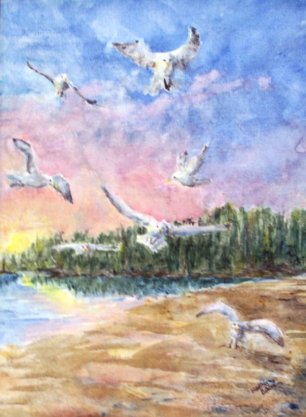 Seagulls flying around looking for a late supper. This is a watercolor painted on canvas.